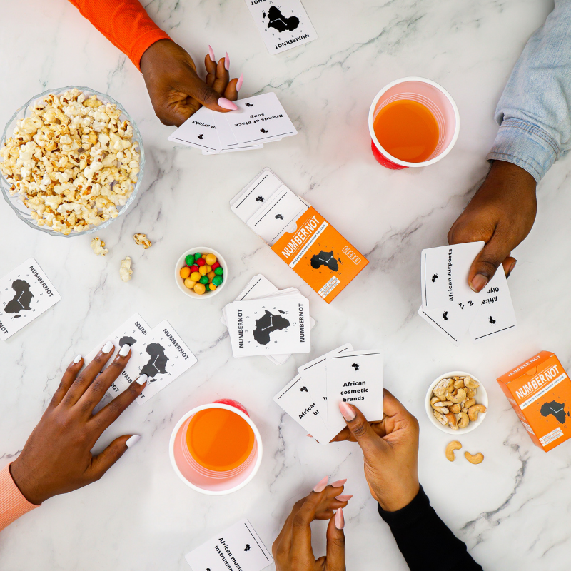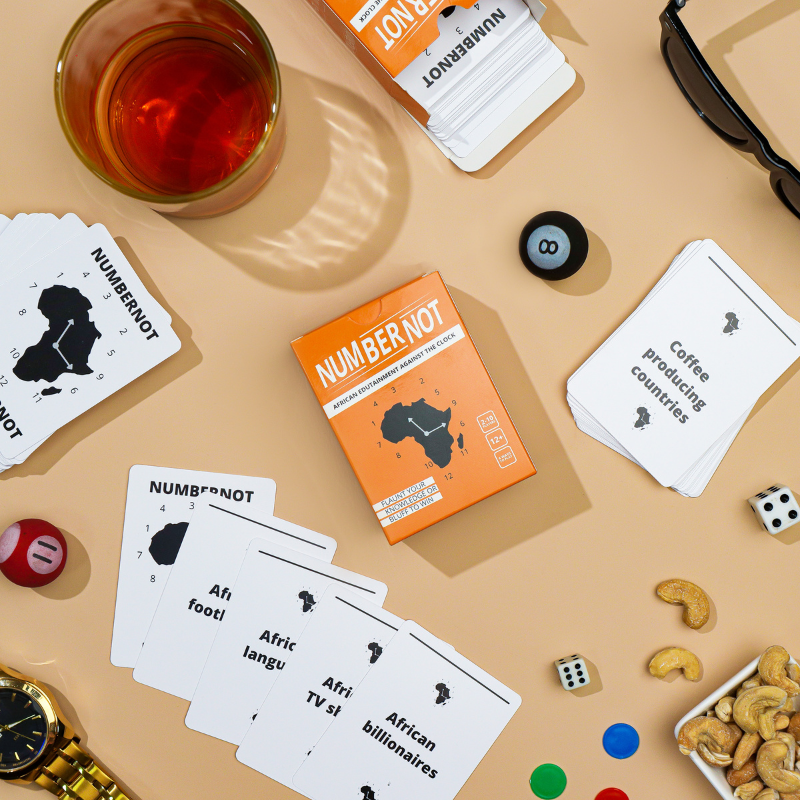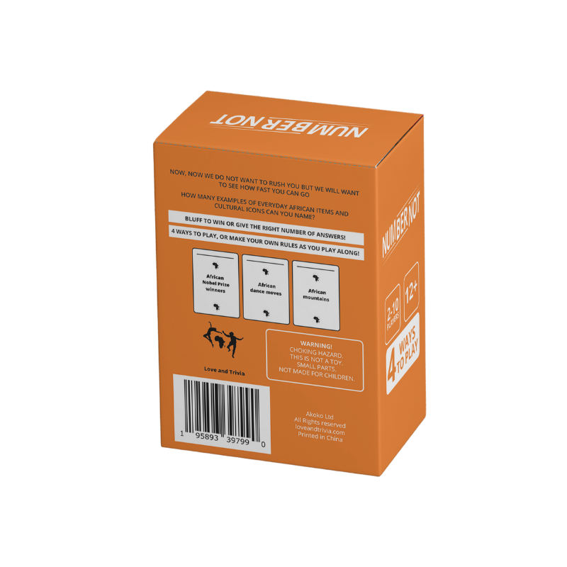 NumberNot is a deck of African inspired card games. With 106 cards each with a subject. The aim to to reveal as many examples of the subject on the card as you can in record time. Remember all answers must be found in or related to Africa. There are four ways to play and you can also create your own rules if your team agrees
